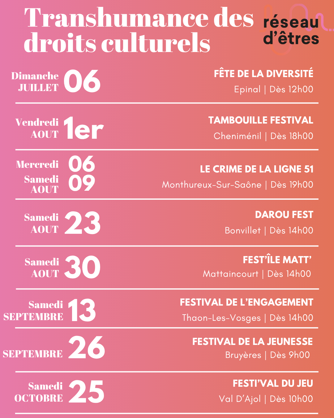 Cette notion de droit culturel constitue une partie de l'ADN du collectif Réseau d'Êtres. Cette année 2025, plus que jamais, il nous apparaît nécessaire de prosélyter sur ces notions, non pas sur le format d'une université populaire comme en 2022, qui nécessiterait au public de se rendre à un évènement supplémentaire parmi le panorama culturel déjà présent sur le territoire vosgien. Il nous apparait plus pertinent de proposer ces animations lors d'évènements culturels déjà présents sur le territoire et organisé par certain·es de nos partenaires, en privilégiant les secteurs sur lesquels nous effectuons des rencontres de mise en lien (cf Rencontres terrain avec acteurs & actrices de la culture)